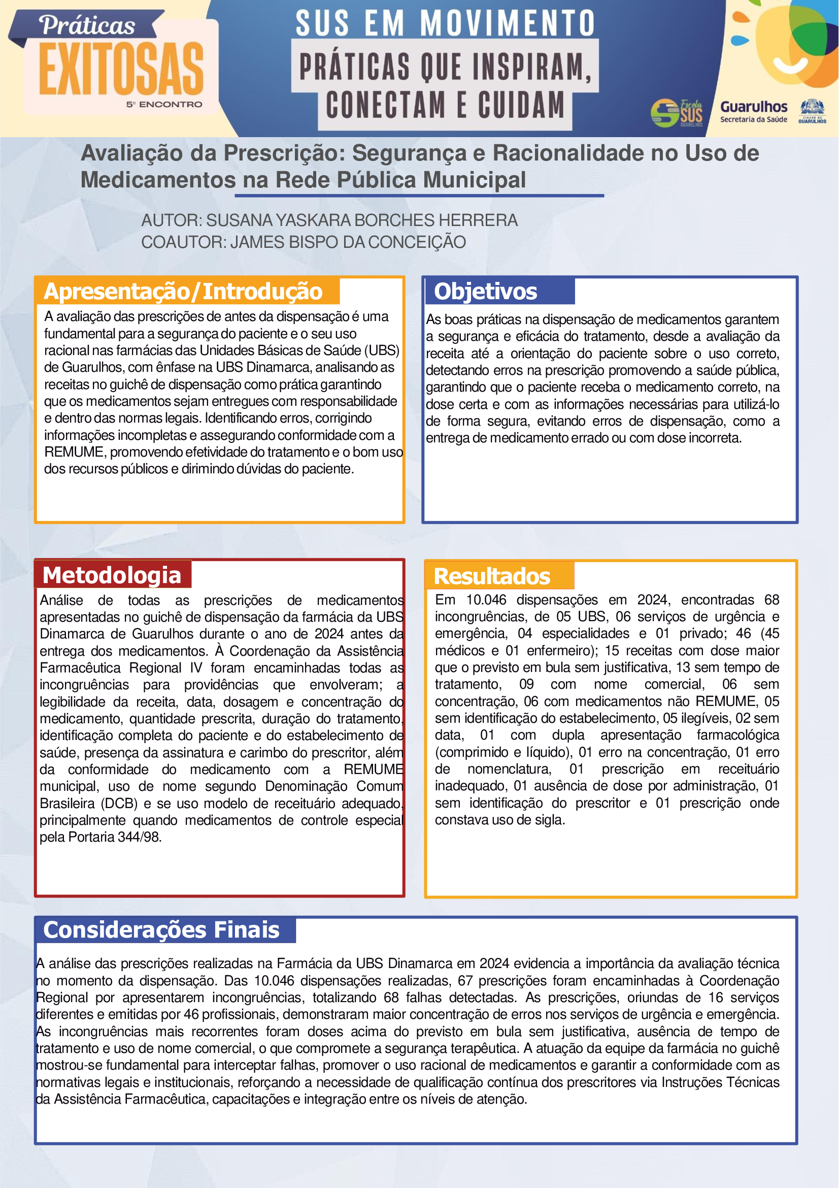 | Avaliação da Prescrição: Segurança e Racionalidade no Uso de Medicamentos na Rede Pública Municipal | SUSANA YASKARA BORCHES HERRERA; JAMES BISPO DA CONCEIÇÃO | |