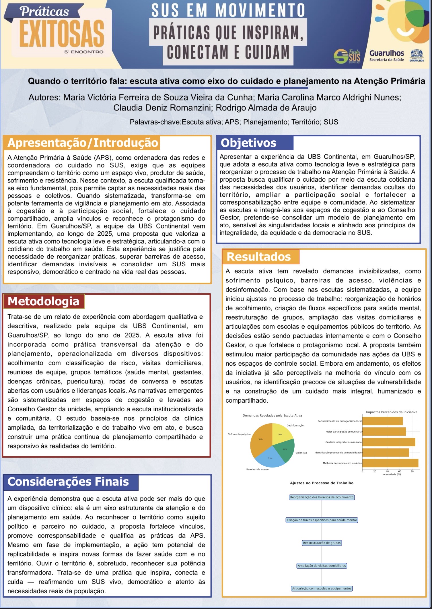 | Quando o território fala: escuta ativa como eixo do cuidado e planejamento na Atenção Primária | Maria Victória Ferreira de Souza Vieira da Cunha; Maria Carolina Marco Aldrighi Nunes; Claudia Deniz Romanzini; Rodrigo Almada de Araujo. | |