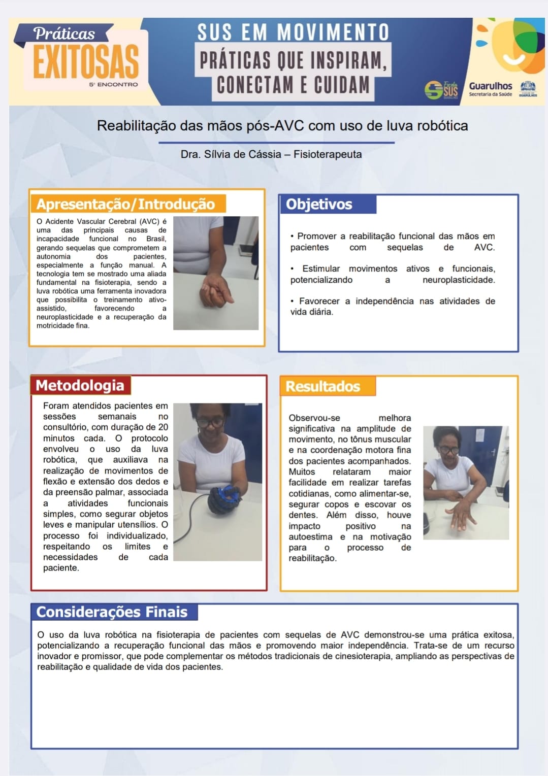 | REABILITAÇÃO DE MÃOS PÓS-AVC COM USO DE LUVA ROBÓTICA | SILVIA DE CASSIA ARAUJO ALVES | |