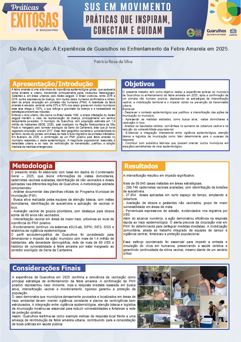| ""Do Alerta à Ação: A Experiência de Guarulhos no Enfrentamento da Febre Amarela em 2025"" | Patrícia Rosa da Silva | |