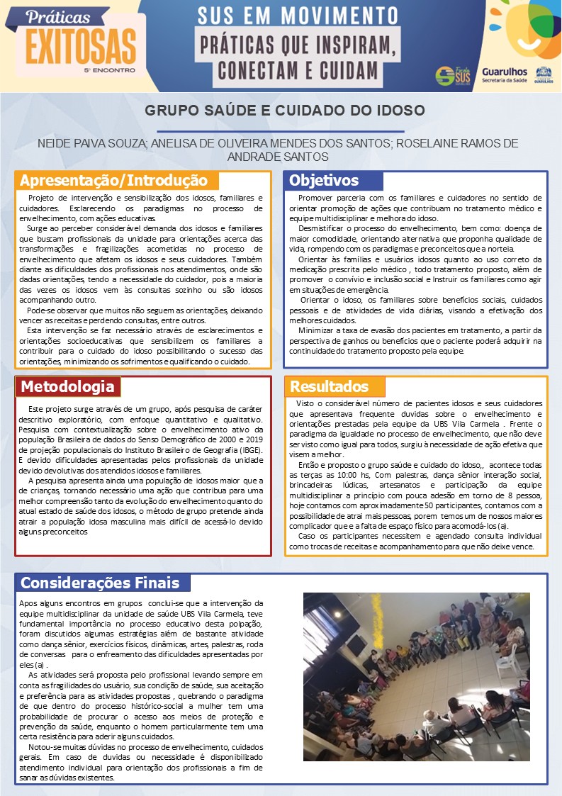 | GRUPO SAÚDE E CUIDADO DO IDOSO. | NEIDE PAIVA SOUZA; Anelisa de Oliveira Mendes dos santos ; Roselaine Ramos de Andrade Santos | |