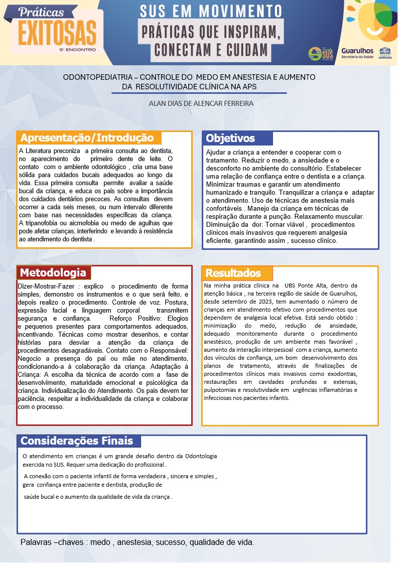 | ODONTOPEDIATRIA – CONTROLE DO MEDO EM ANESTESIA E AUMENTO DA RESOLUTIVIDADE CLÍNICA NA APS | ALAN DIAS DE ALENCAR FERREIRA | |