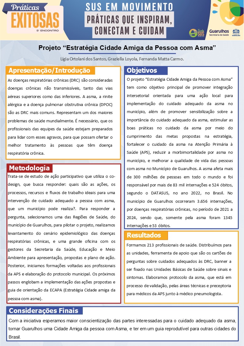 | Projeto “Estratégia Cidade Amiga da Pessoa com Asma” | Lígia Ortolani dos Santos; Graziella Loyola; Fernanda Matta Carmo | |