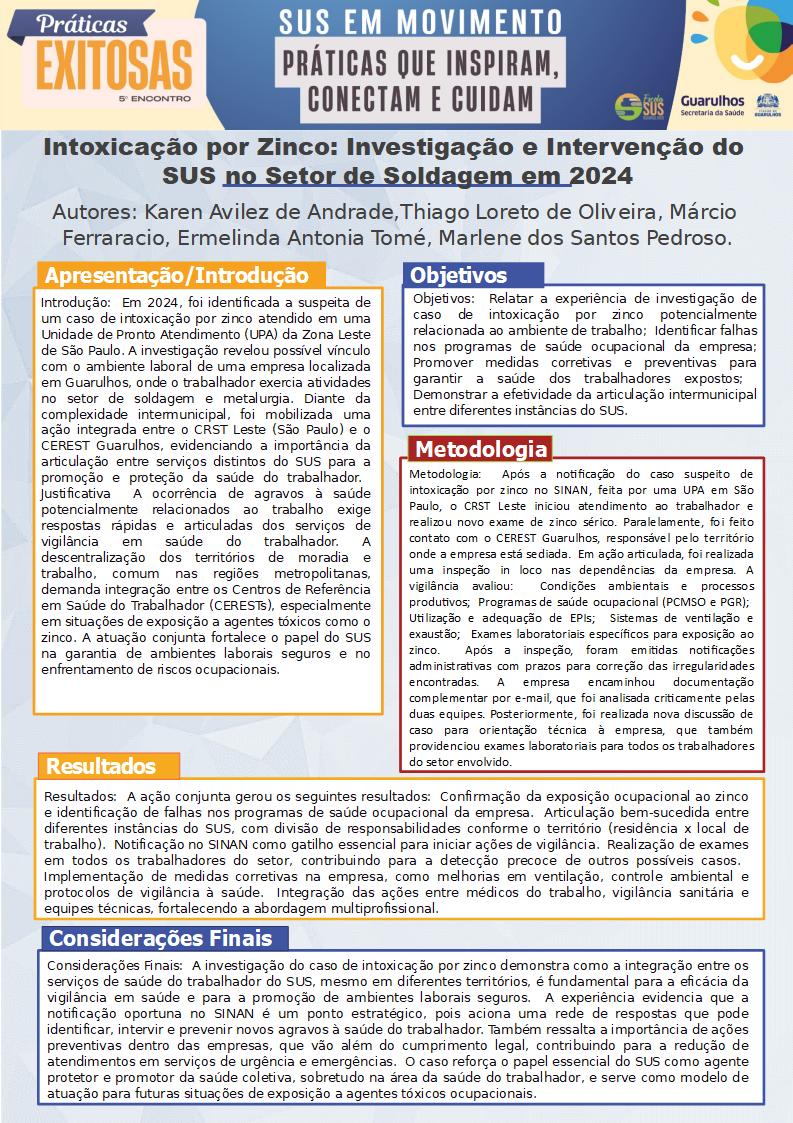 | Intoxicação por Zinco: Investigação e Intervenção do SUS no Setor de Soldagem em 2024. | Karen Avilez de Andrade; Marcio Ferraracio; Ermelinda Antonia Tomé; Marlene dos Santos Pedroso; Thiago Loreto de Oliveira. | |