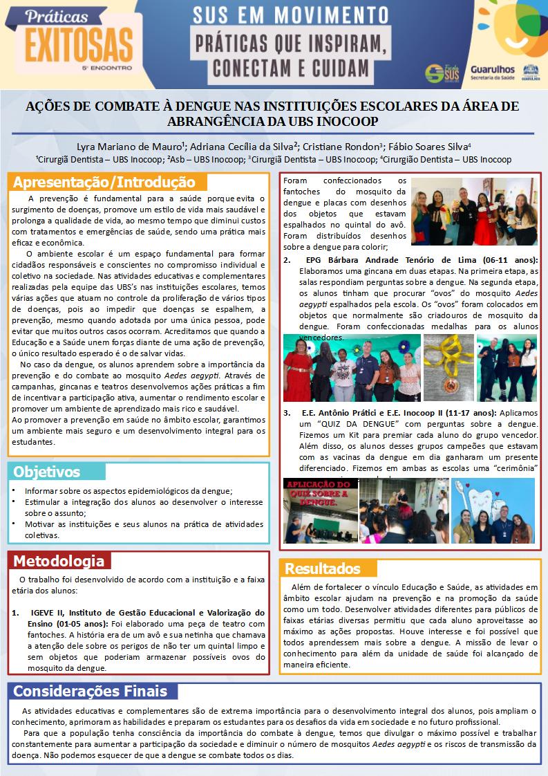Menção Honrosa AÇÕES DE COMBATE À DENGUE NAS INSTITUIÇÕES ESCOLARES DA ÁREA DE ABRANGÊNCIA DA UBS INOCOOP |
