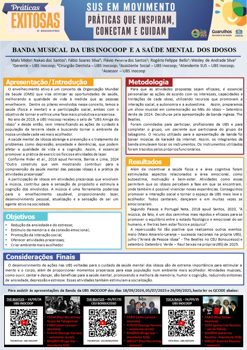 | BANDA MUSICAL DA UBS INOCOOP E A SAÚDE MENTAL DOS IDOSOS | Malu Midori Nakao dos Santos; Fábio Soares Silva; Flávio Pereira dos Santos; Rogério Felippe Bello; Wesley de Andrade Silva | |