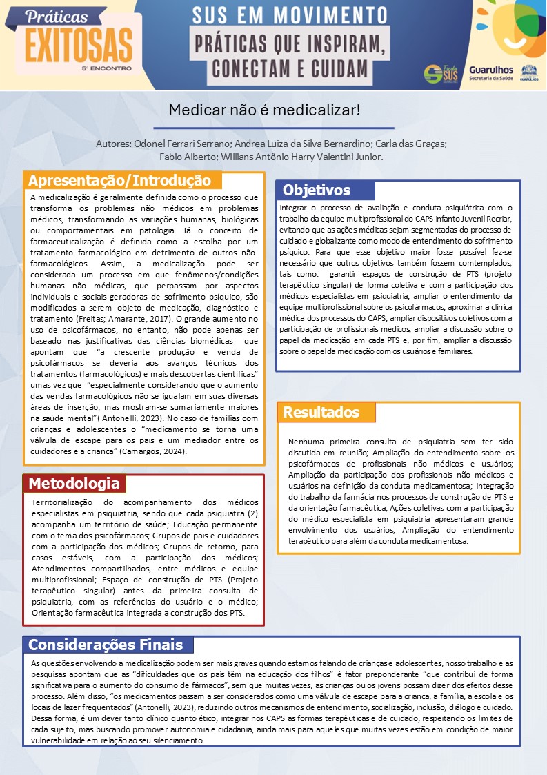 | Medicar não é medicalizar! | Odonel Ferrari Serrano; Andrea Luiza da Silva Bernardino; Carla das Graças Sampaio; Fabio Alberto Percilio; Willians Antonio Harry Valentini Junior. | |