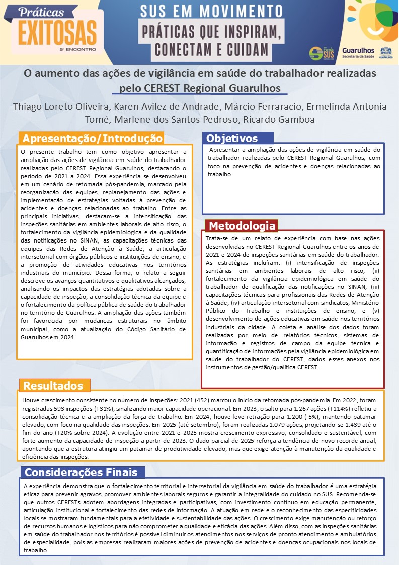 | O aumento das ações de vigilância em saúde do trabalhador realizadas pelo CEREST Regional Guarulhos | Marcio Ferraracio; Thiago Loreto de Oliveira; Ermelinda Antonia Tomé; Karen Avilez de Andrade; Marlene dos Santos Pedroso; Thiago Loreto de Oliveira. | |