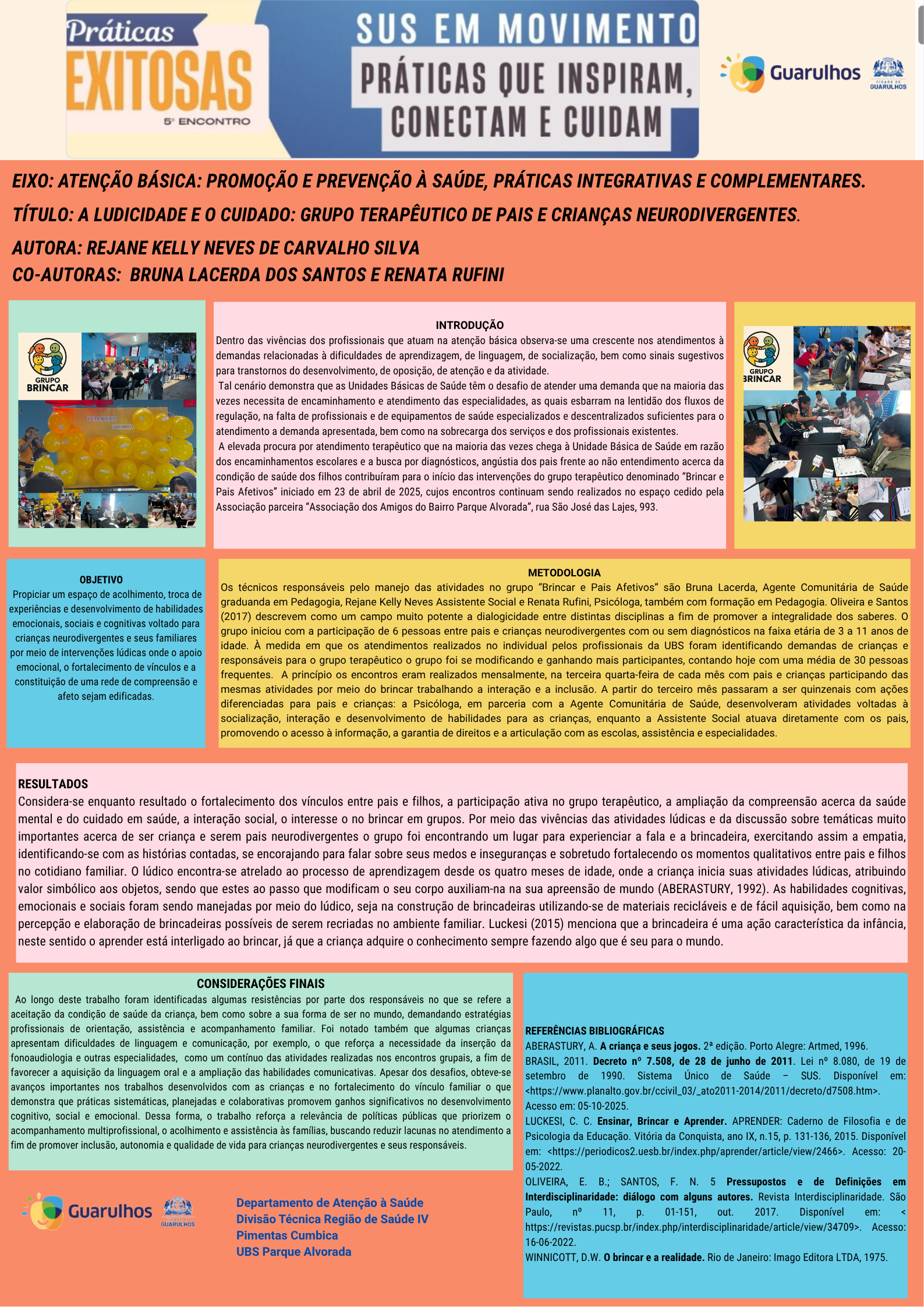 | A Ludicidade e o Cuidado: Grupo Terapêutico de Pais e Crianças Neurodivergentes. | Rejane Kelly Neves de Carvalho Silva; Bruna Lacerda dos Santos; Renata Rufini. | |