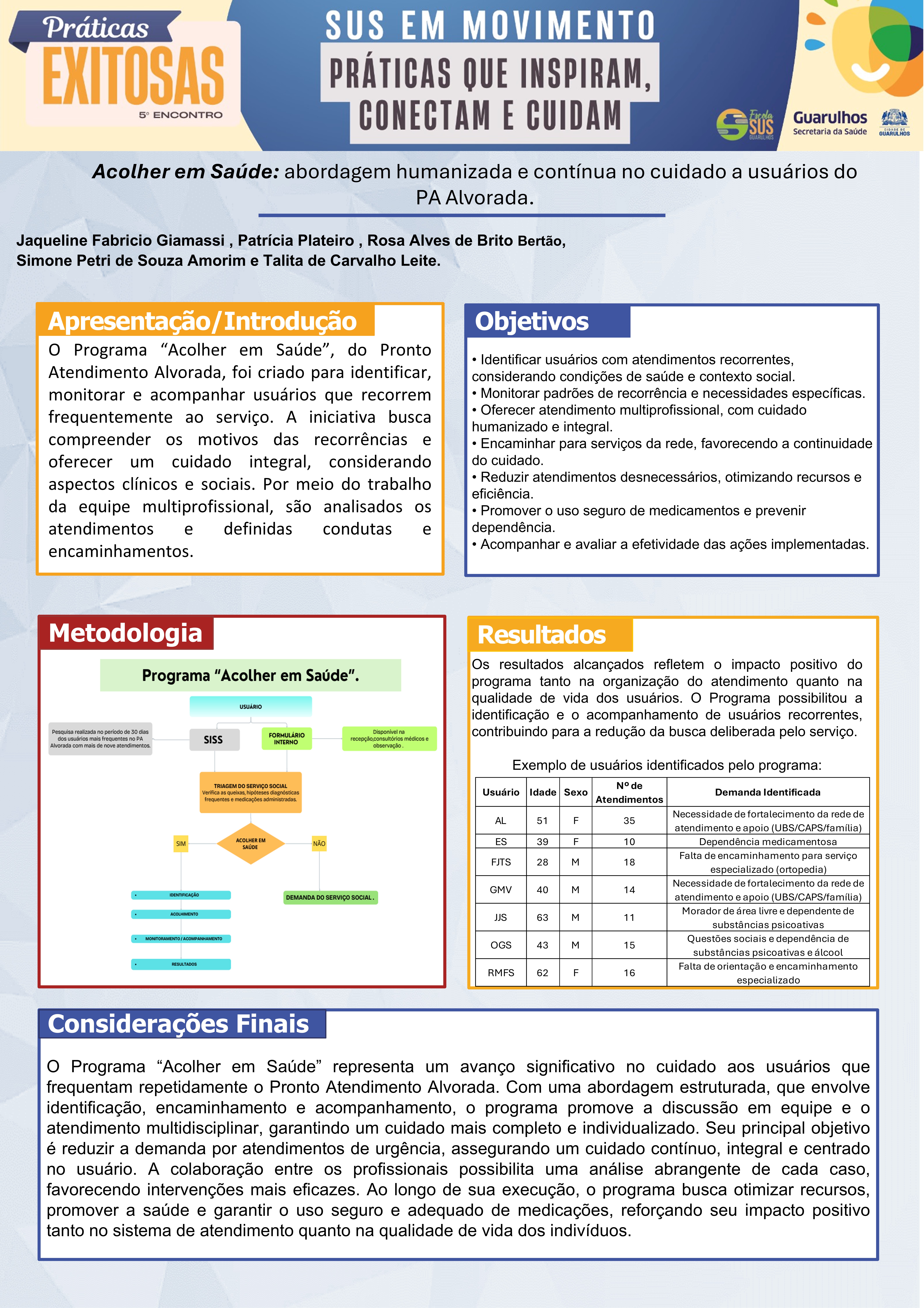 | Acolher em Saúde: abordagem humanizada e contínua no cuidado a usuários do PA Alvorada | Talita de Carvalho Leite; Jaqueline Fabricio Giamassi; Patricia Plateiro; Rosa Alves de Brito Bertao; Simone Petri de Souza Amorim | |