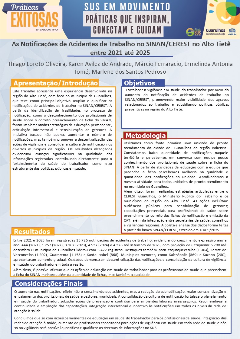 | As Notificações de Acidentes de Trabalho no SINAN/CEREST no Alto Tietê entre 2021 até 2025 | Thiago Loreto de Oliveira; Marcio Ferraracio; Ermelinda Antonia Tomé; Karen Avilez de Andrade; Marlene dos Santos Pedroso; | |