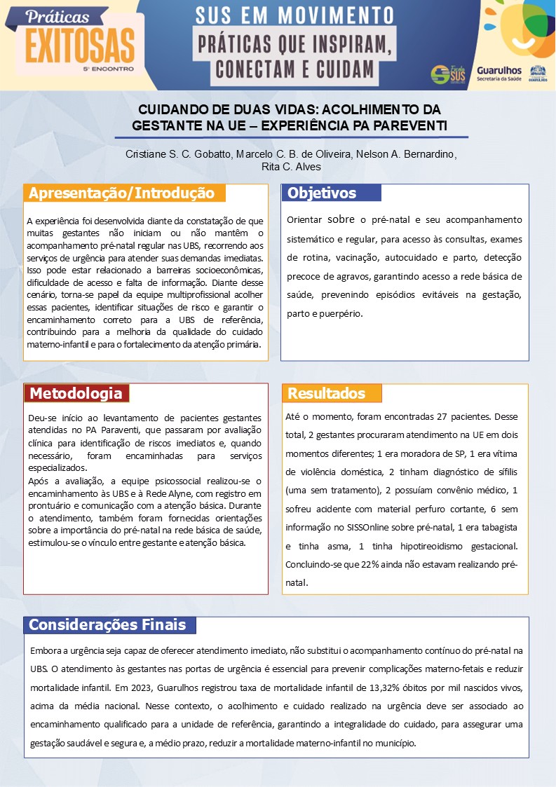 | CUIDANDO DE DUAS VIDAS: ACOLHIMENTO DA GESTANTE NA URGÊNCIA E EMERGÊNCIA – EXPERIÊNCIA PA PARAVENTI | Cristiane Solimã Carreira Gobatto; Rita de Cássia Alves Bezerra; Marcelo Cordeiro Barreto de Oliveira; Nelson Alves Bernardino | |