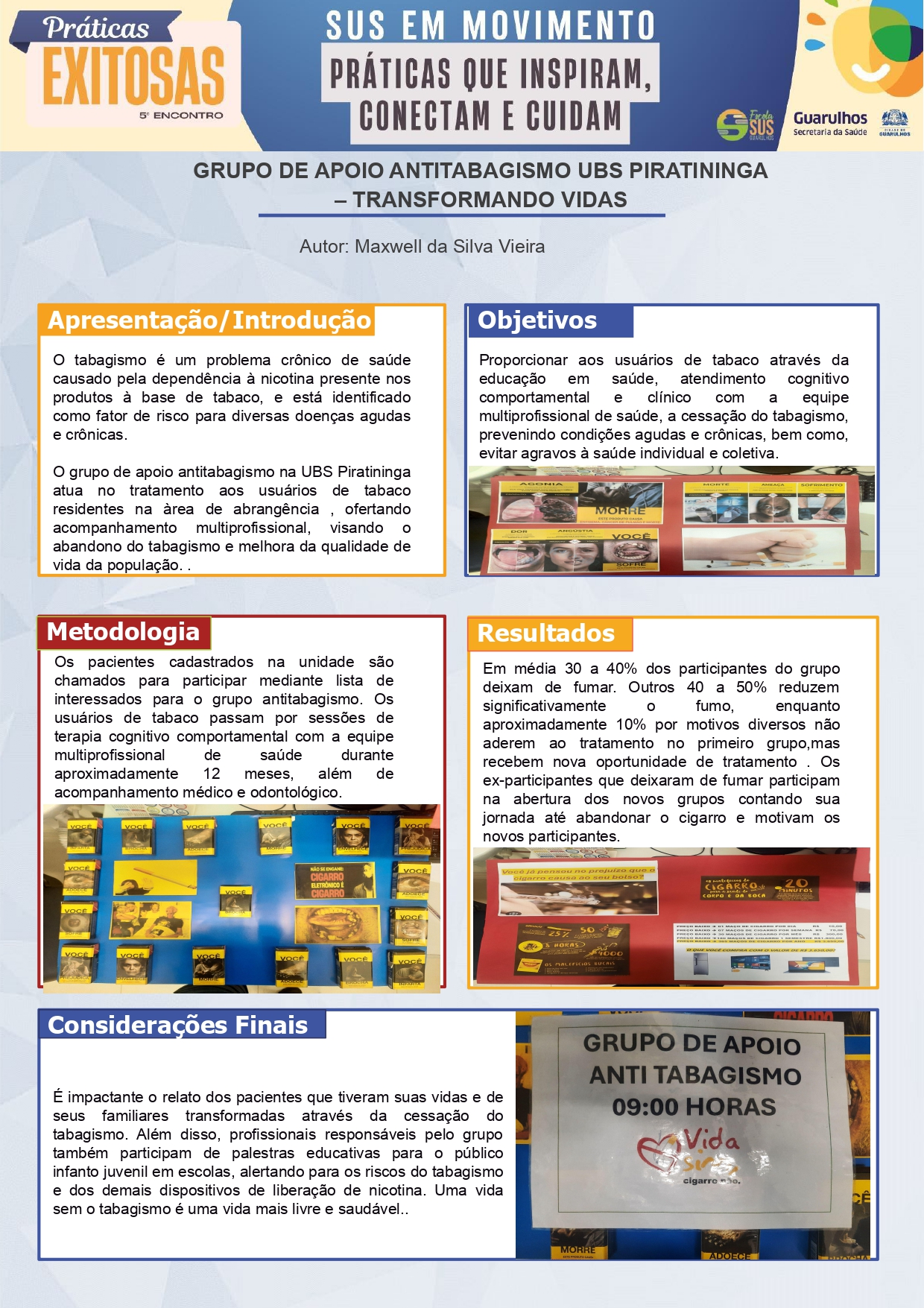 | GRUPO DE APOIO ANTITABAGISMO UBS PIRATININGA – TRANSFORMANDO VIDAS | Maxwell da Silva Vieira | |
