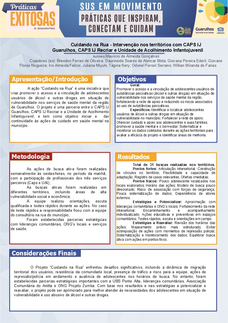 | Cuidando na Rua - Intervenção nos territórios com CAPS IJ Guarulhos, CAPS IJ Recriar e UAI | Mauricio de Almeida Gonçalves; Brendon Ferrari de Oliveira; Daurineide Soares de Alencar Mota; Giovanna Pereira Ederli; Giovane Flores Nogueira; Iris Almeida Felicio; Juliana Miyuki Tatsuguchi; Tagina Nery; Odonel Ferrari Serrano; Willian Miranda de Farias. | |