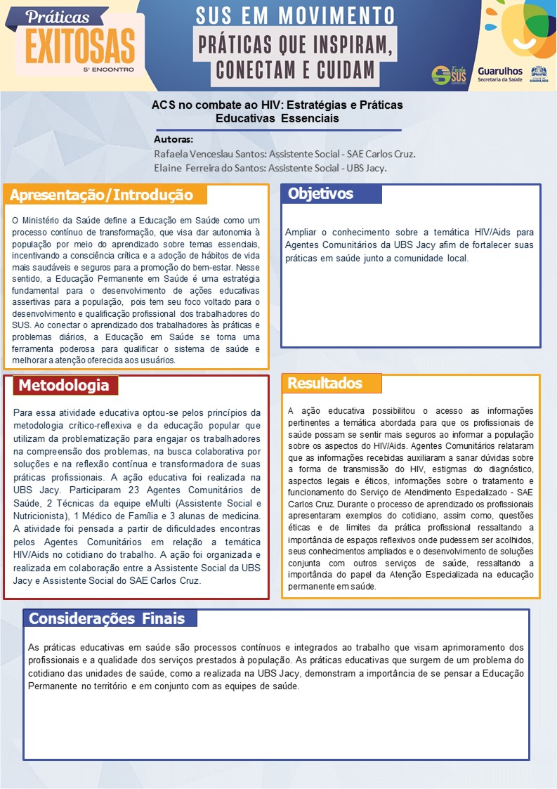 | ACS no combate ao HIV: Estratégias e Práticas Educativas Essenciais | Rafaela Venceslau Santos; Elaine Ferreira dos Santos. | |