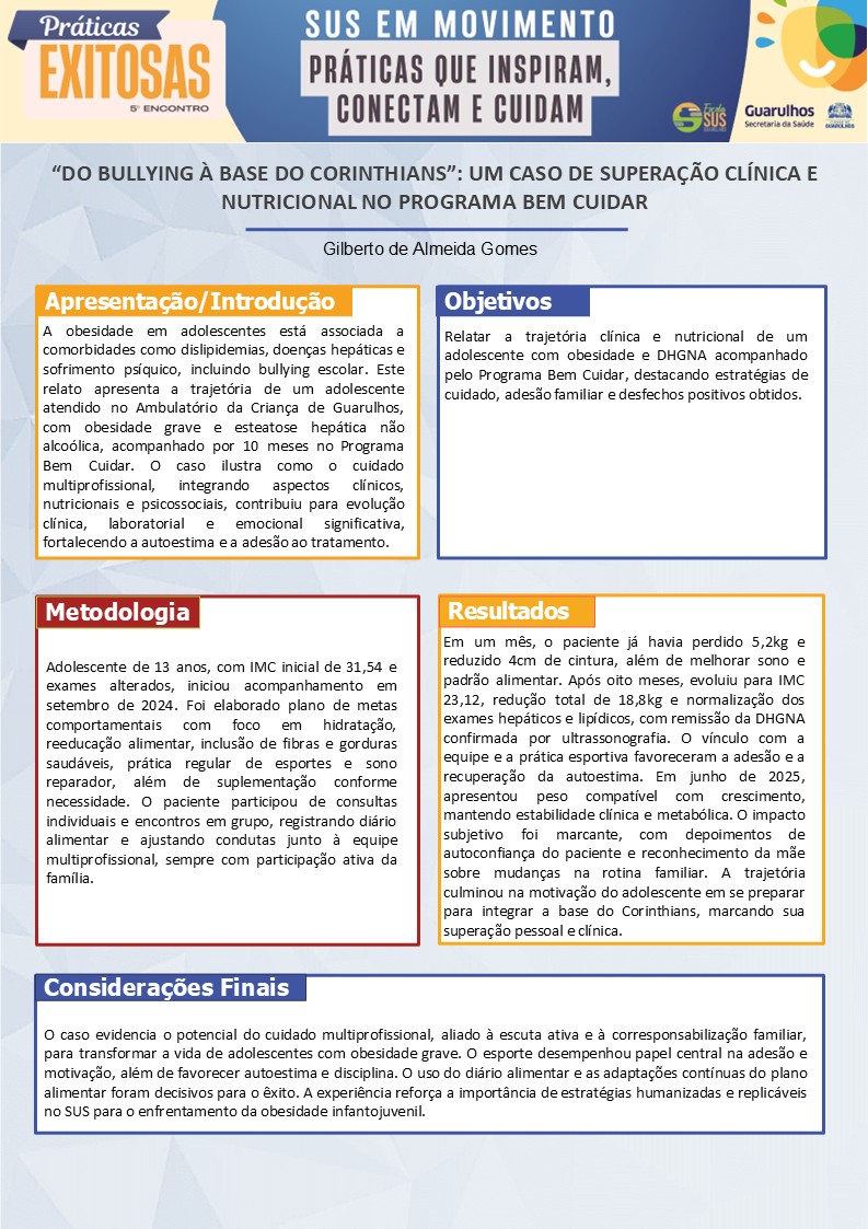 | ""Do bullying à base do Corinthians"": caso de superação clínica e nutricional no Programa Bem Cuidar | Gilberto de Almeida Gomes | |