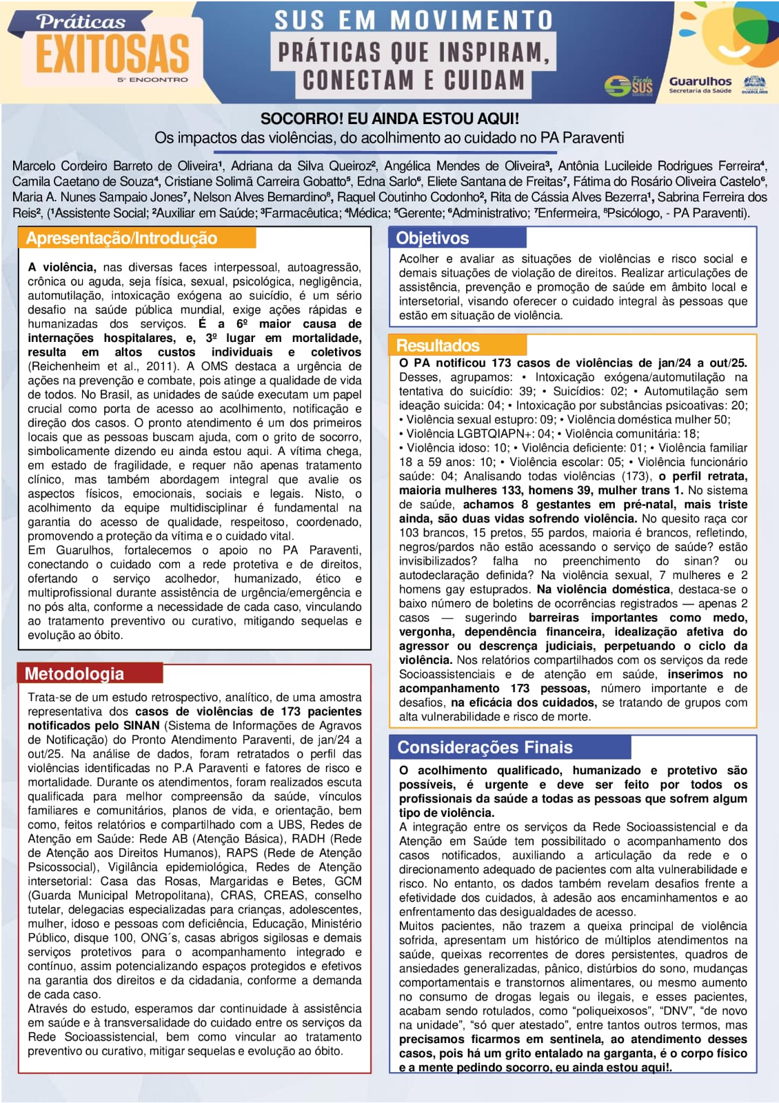 2º Lugar - Prêmio Destaque Socorro! Eu ainda estou aqui: Os impactos das violências, do acolhimento ao cuidado no PA Paraventi |