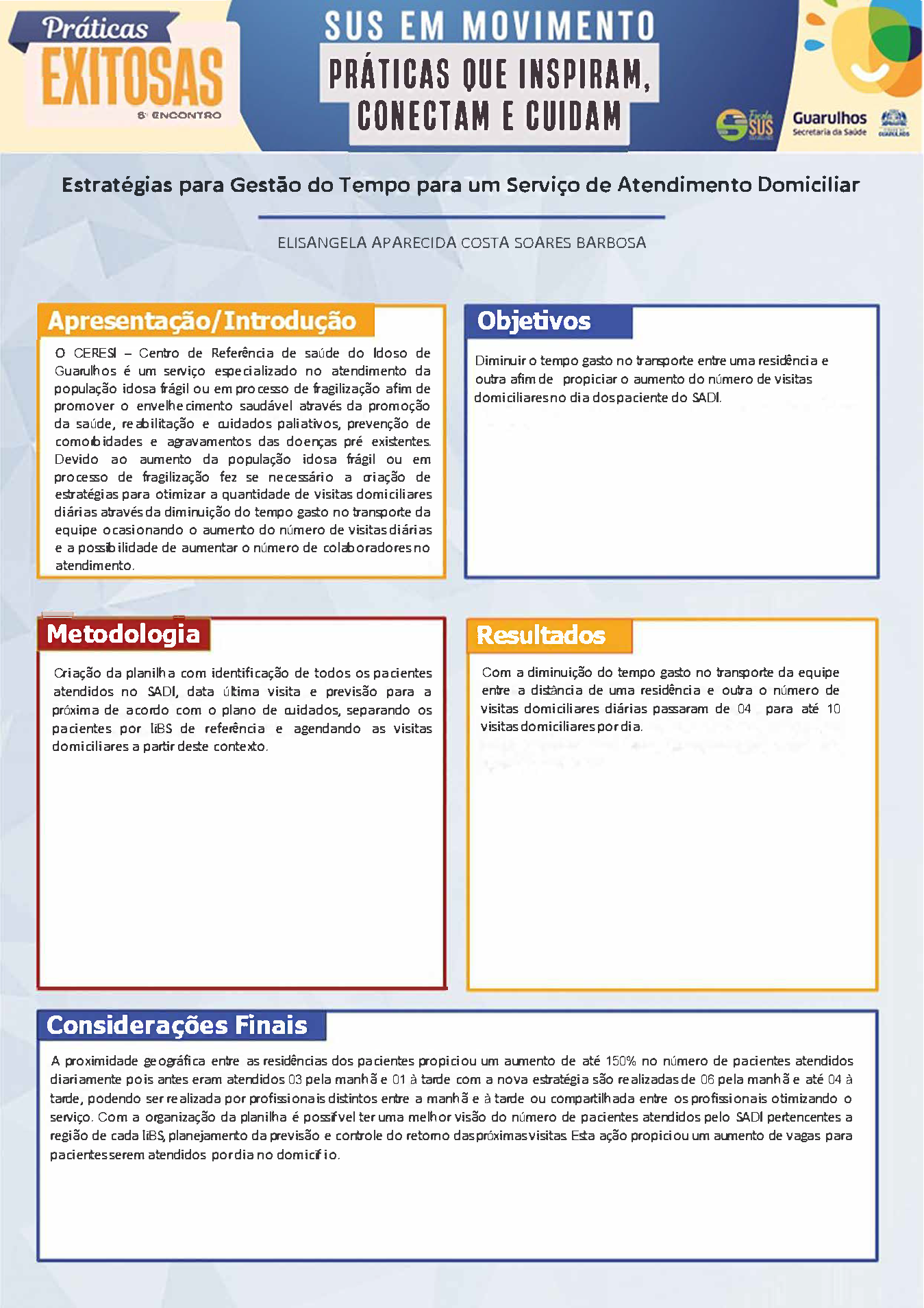 | Estratégias para Gestão do Tempo para um Serviço de Atendimento Domiciliar | Elisangela Aparecida Costa Soares Barbosa; | |