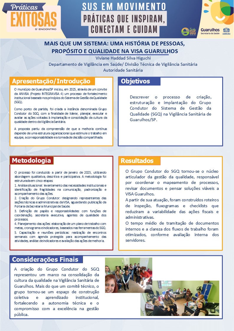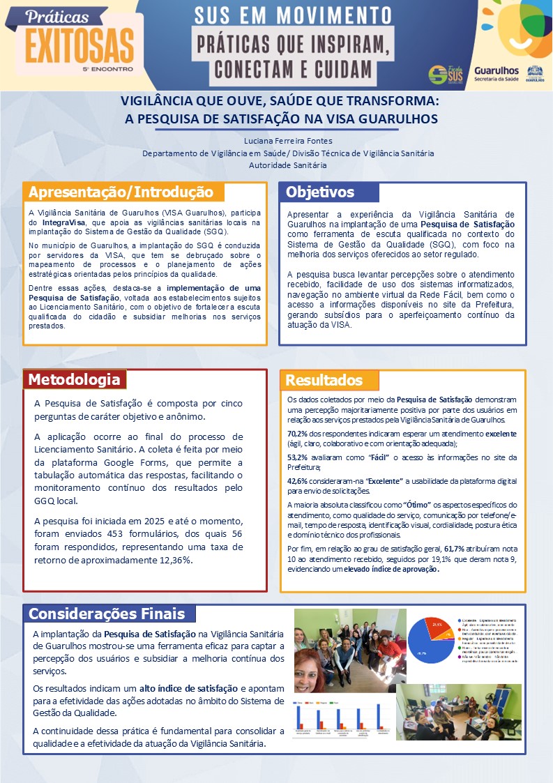 | Vigilância que Ouve, Saúde que Transforma: a Pesquisa de Satisfação na VISA Guarulhos | Luciana Ferreira Fontes; Ana Cristina de Fátima Lima; Astréia Cibele Geny Francisca de Paula; Maria Aparecida Gomes da Silva Lopes; Mariane Lima da Costa; Patrícia Akemi Kawai; Renata Reinhardt Carvalho; Rosana Cosme da Silva; Rosemeire Sena Lopes; Silvia Moura Frata; Sonia Aparecida Bemfica Nascimento; Valeska Aubin Zanetti Mion; Vanderlei Carneiro da Silva; Viviane Haddad Silva Higuchi. | |