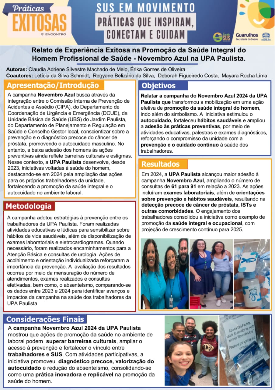 | Relato de Experiência na Saúde do Homem Profissional de Saúde na UPA Paulista. | Cláudia Adriene Silvestre Machado de Melo; Érika Gomes de Oliveira; Leticia da Silva Schnidt; Regyane Belizário da Silva; Deborah Figueiredo Costa; Mayara Rocha Lima. | |