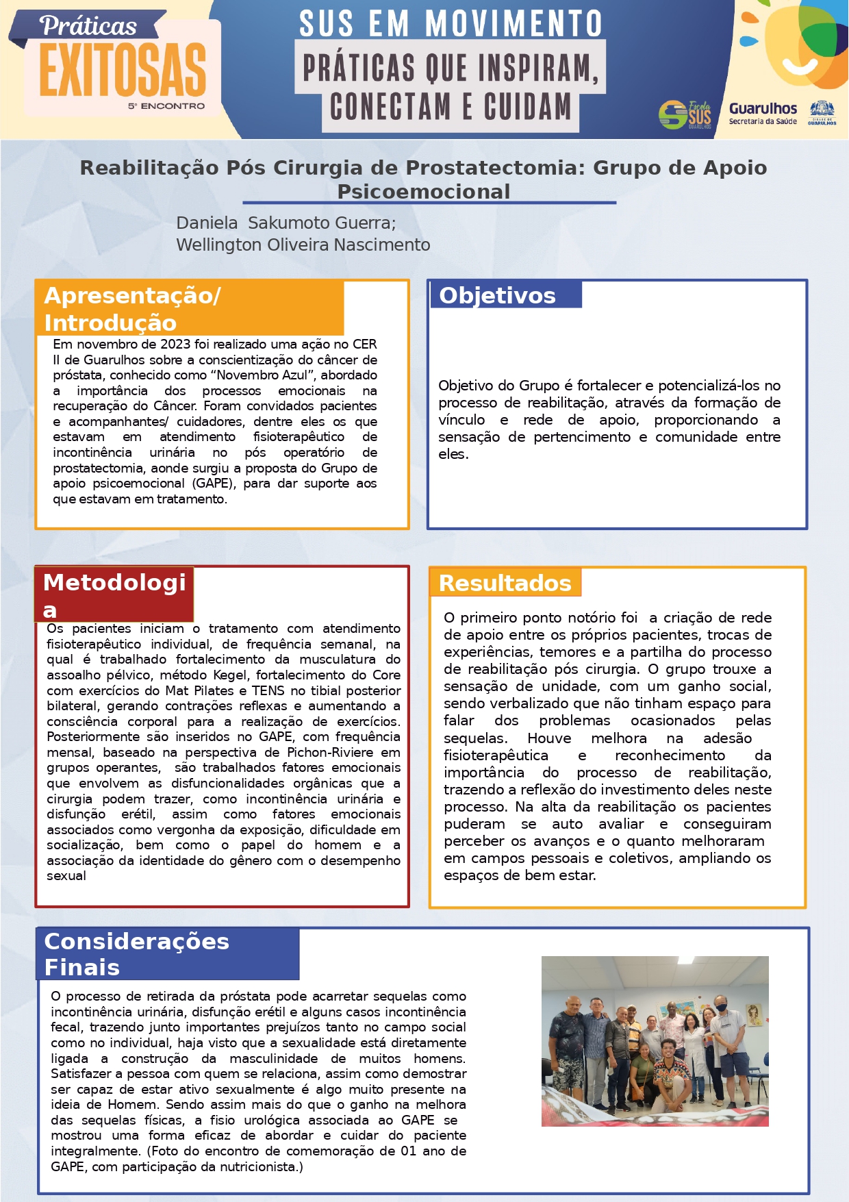 | Reabilitação Pós Cirurgia de Prostatectomia: Grupo de Apoio Psicoemocional | Wellington Oliveira Nascimento; Daniela Sakumoto Guerra. | |