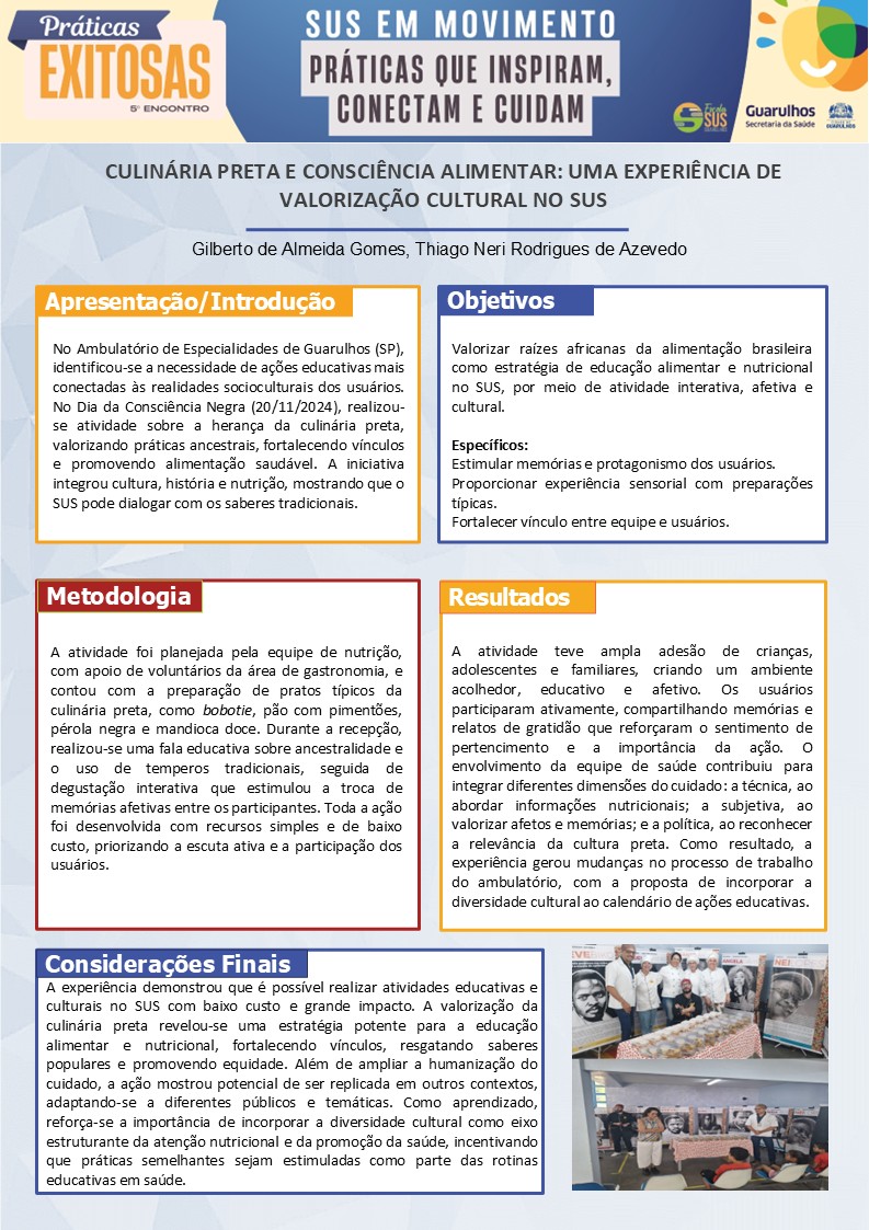 | Culinária Preta e Consciência Alimentar: uma experiência de valorização cultural no SUS | Gilberto de Almeida Gomes; Thiago Neri Rodrigues de Azevedo | |