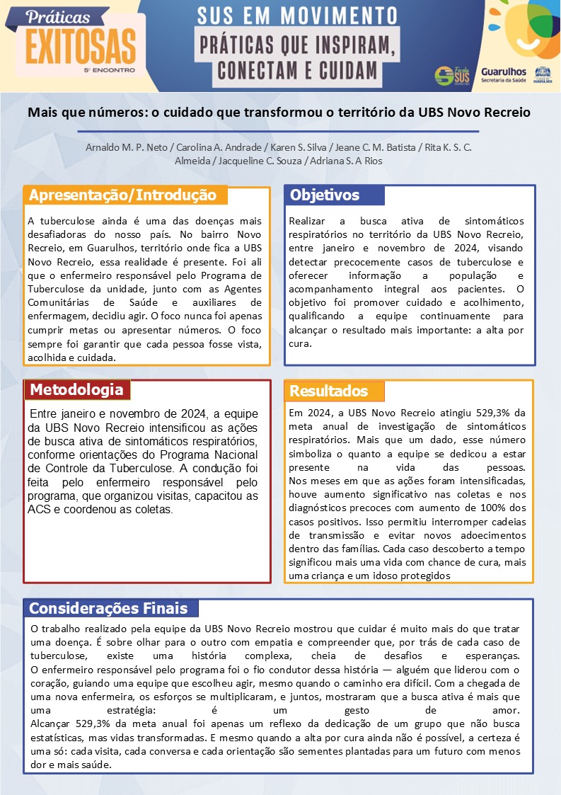 | Mais que números: o cuidado que transformou o território da UBS Novo Recreio | Arnaldo Marques Pereira Neto; Rita de Kassia Sousa Castro de Almeida; Adriana Silva de Araujo Rios; Jacqueline Carneiro de Souza; Karen dos Santos Silva; Carolina Almeida de Andrade; Jeane de Camargo Matos Batista. | |