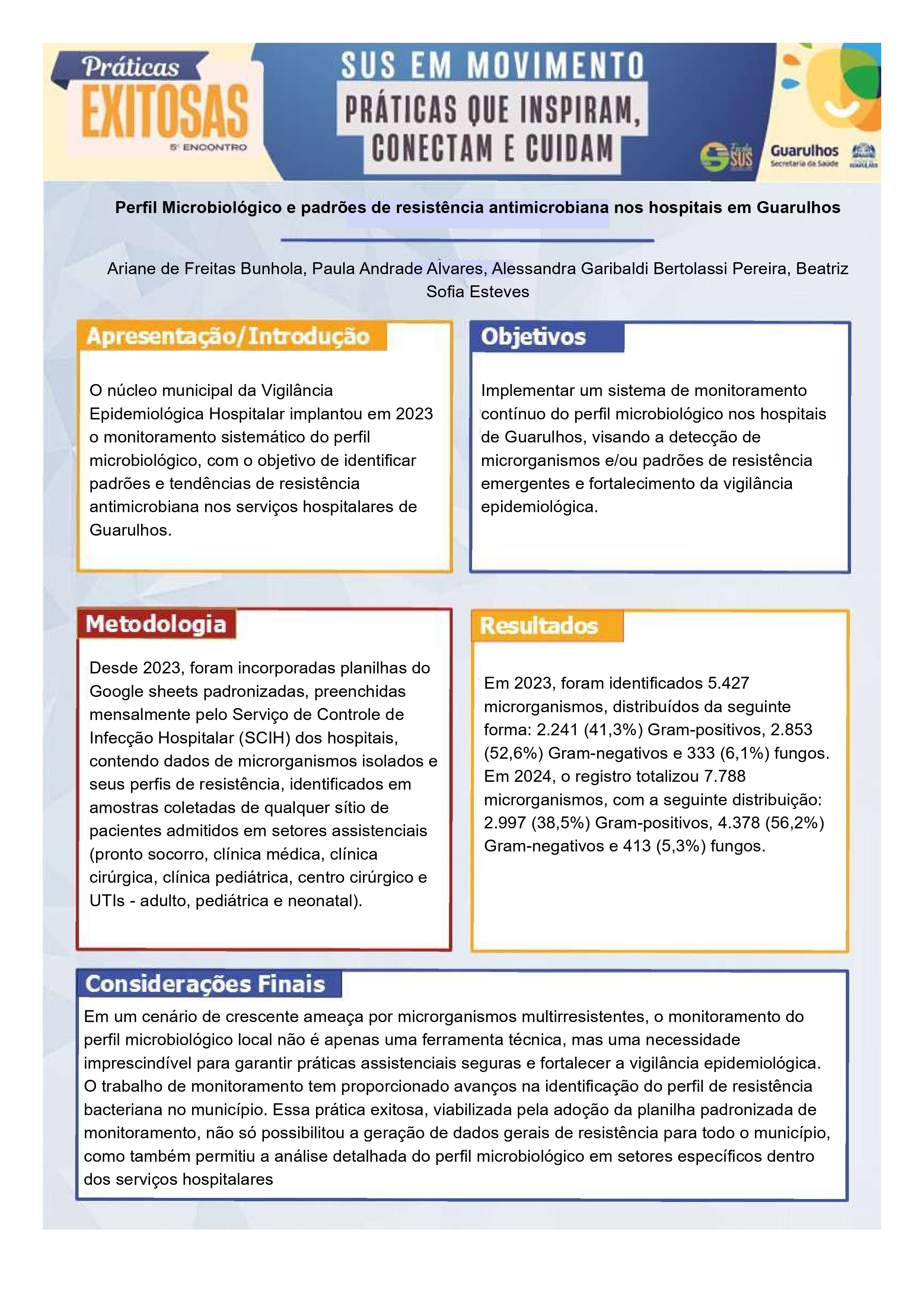 | Perfil Microbiológico e padrões de resistência antimicrobiana nos hospitais em Guarulhos | Ariane de Freitas Bunhola; Paula Andrade Alvares, Alessandra Garibaldi Bertolassi Pereira, Beatriz Sofia Esteves. | |