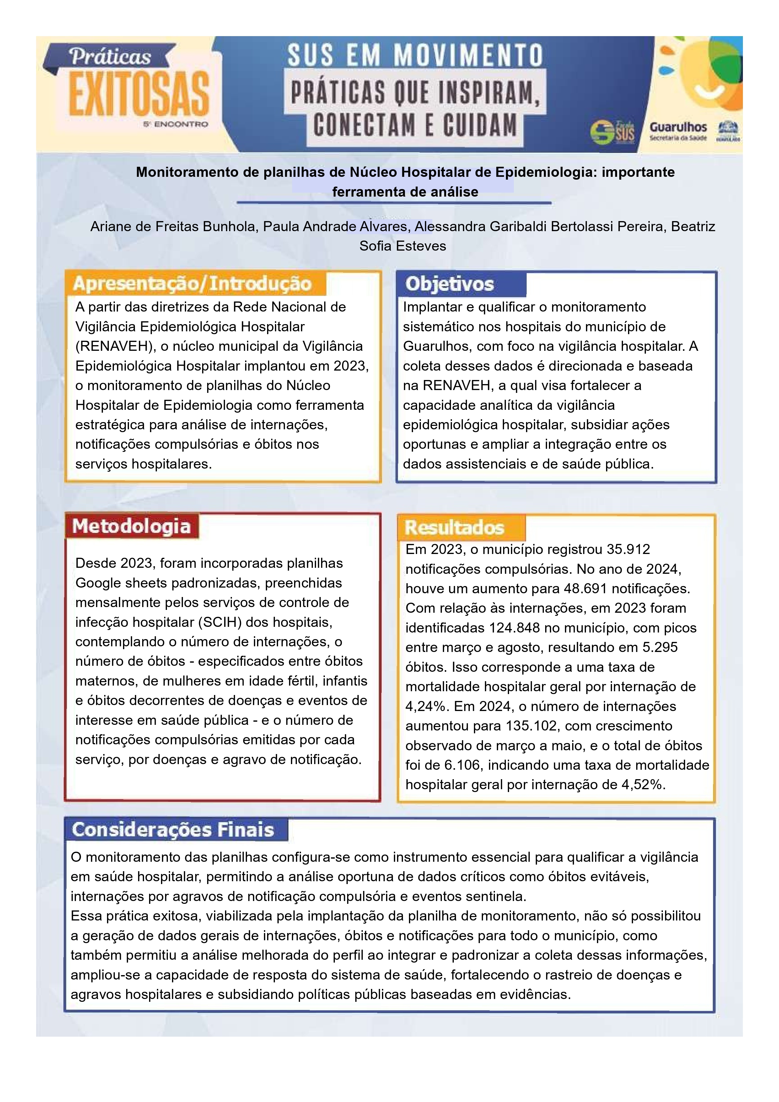 | Monitoramento de planilhas de Núcleo Hospitalar de Epidemiologia: importante ferramenta de análise | Ariane de Freitas Bunhola; Paula Andrade Alvares, Alessandra Garibaldi Bertolassi Pereira, Beatriz Sofia Esteves. | |