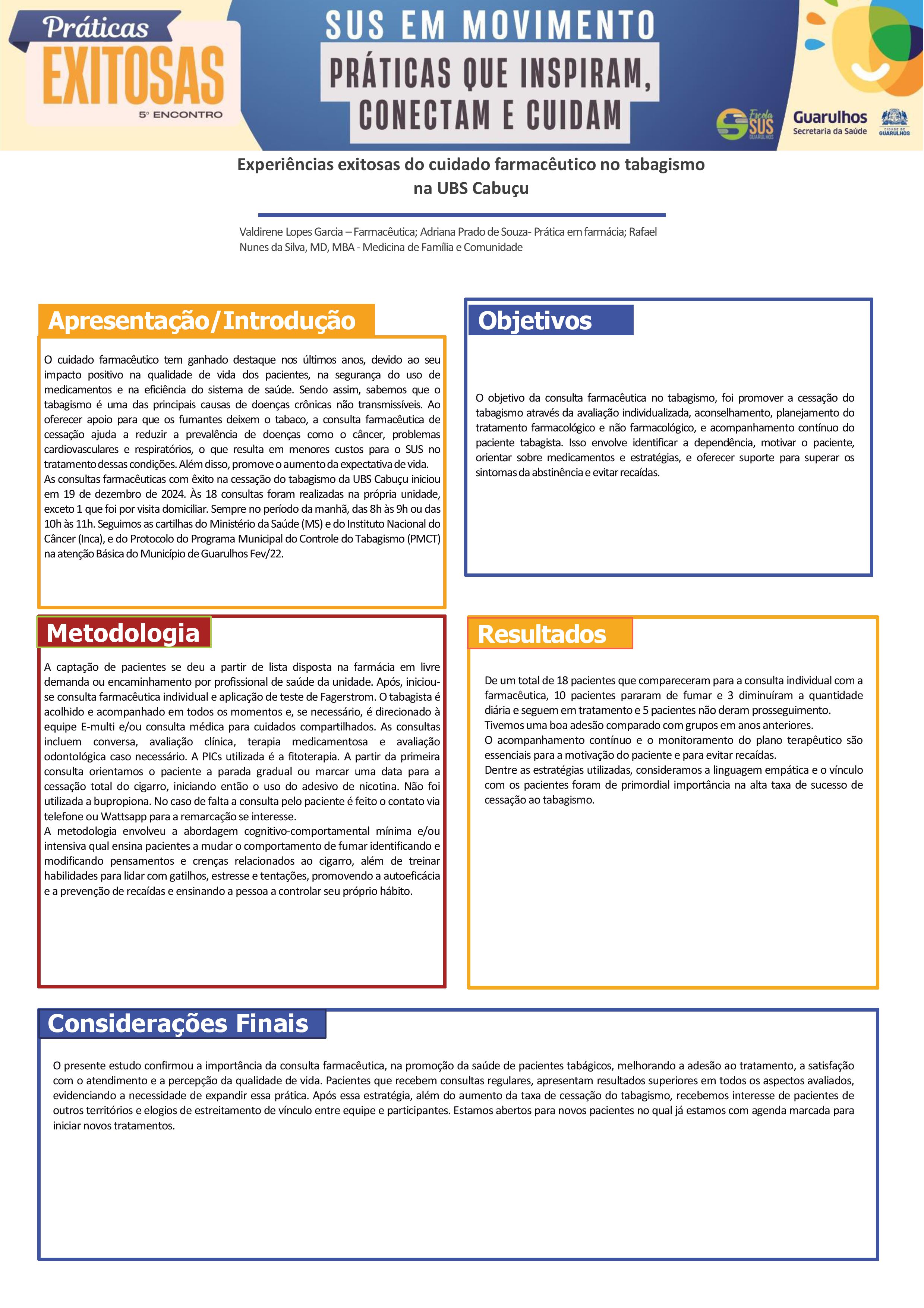 | Experiências exitosas no cuidado farmacêutico no tabagismo na UBS Cabuçu | Valdirene Lopes Garcia; Rafael Nunes da Silva. | |