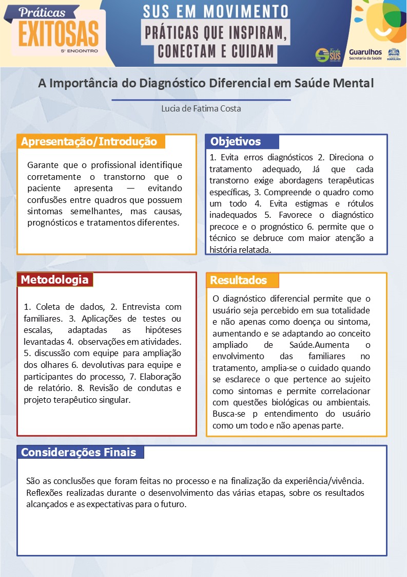 | A importância do diagnóstico diferencial em Saúde Mental | Lucia de Fatima Costa | |
