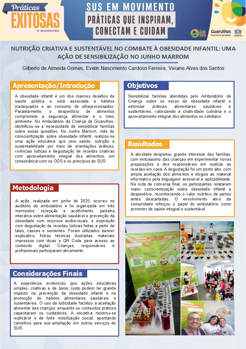 | Nutrição Criativa e Sustentável no Combate à Obesidade Infantil: Ação de Sensibilização Junho Marrom | Gilberto de Almeida Gomes; Evelin Nascimento Cardoso Ferreira; Viviane Alves dos Santos | |