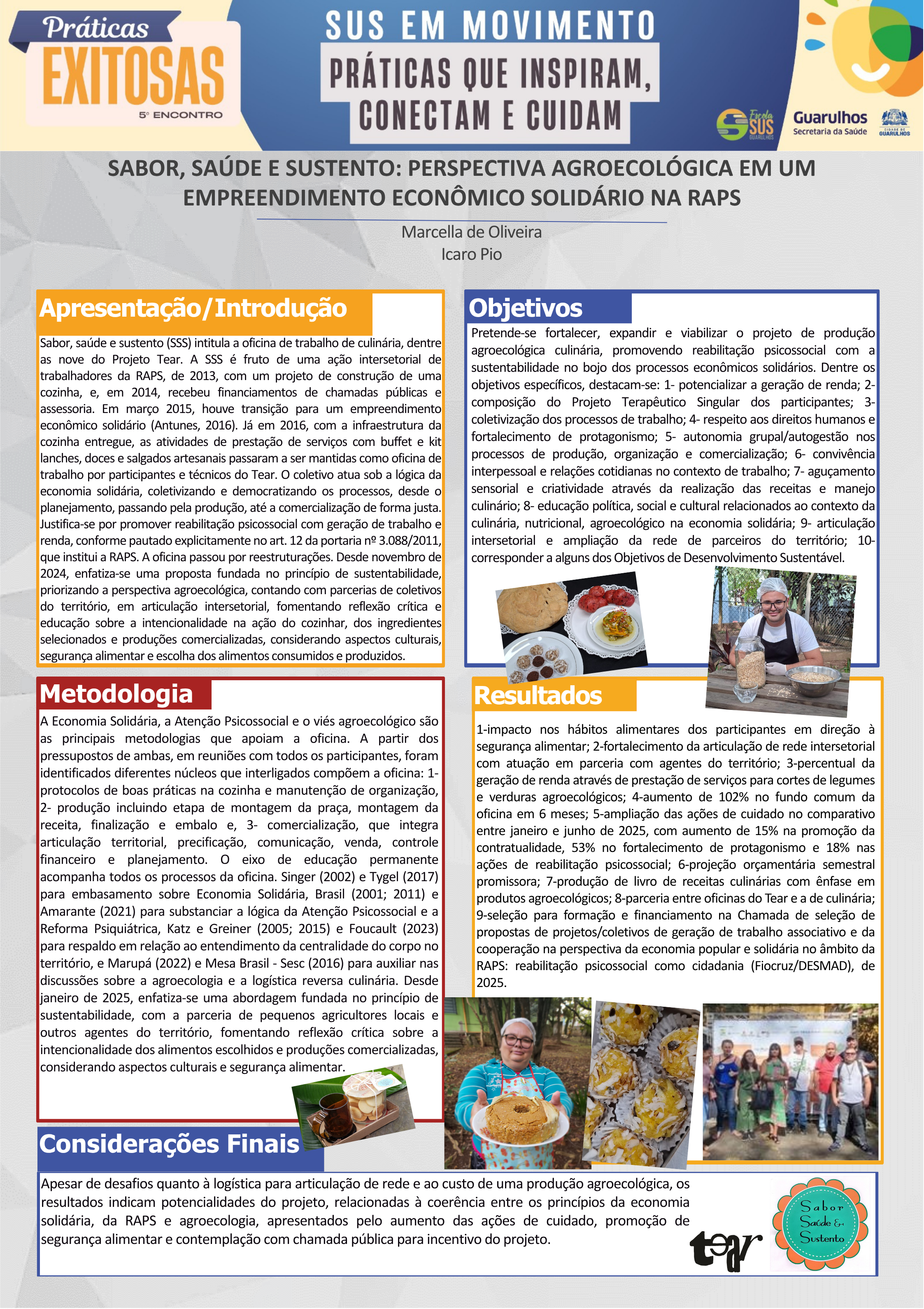 | SABOR, SAÚDE E SUSTENTO: PERSPECTIVA AGROECOLÓGICA EM UM EMPREENDIMENTO ECONÔMICO SOLIDÁRIO NA RAPS | Marcella de Oliveira; Icaro Pio Oliveira. | |