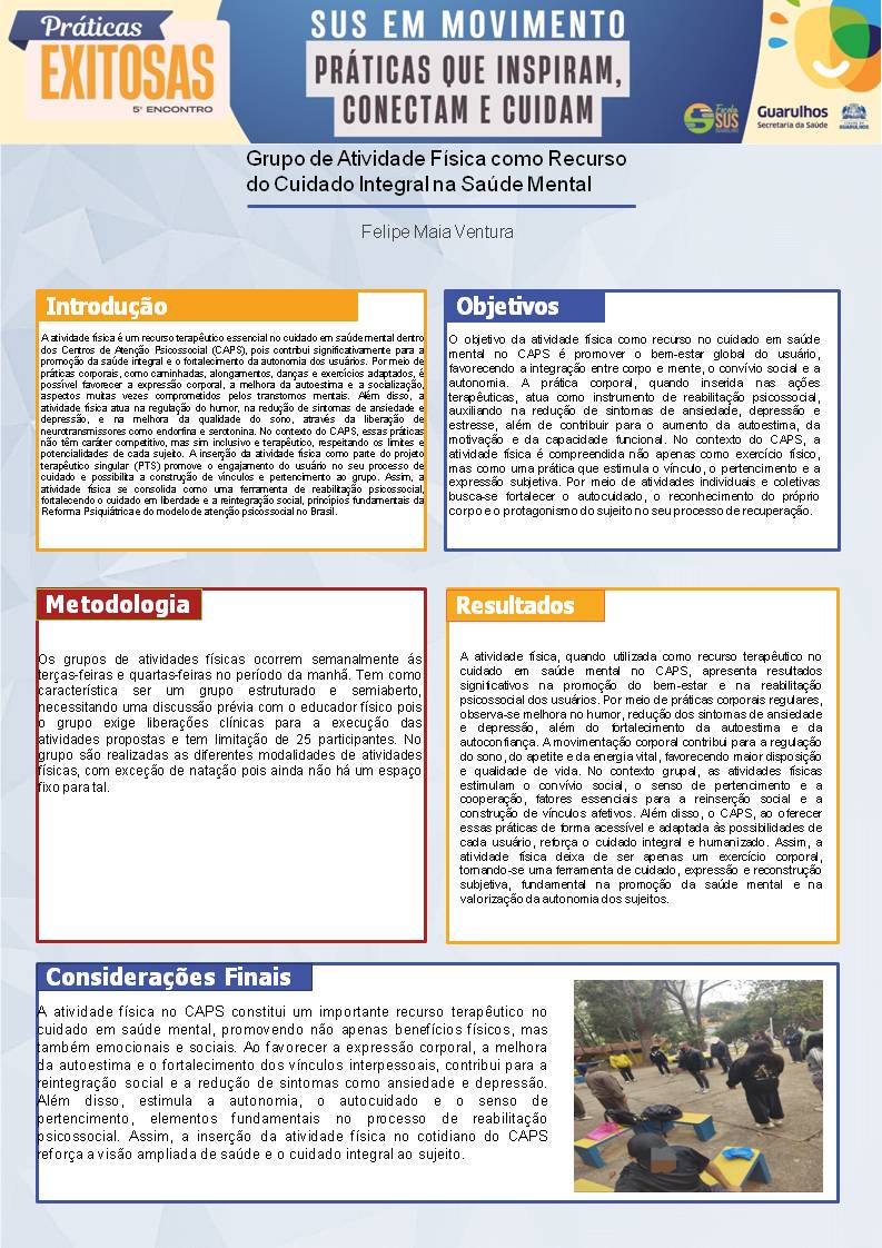 | Grupo de Atividade Física como recurso do cuidado integral na saúde mental | Felipe Maia Ventura | |