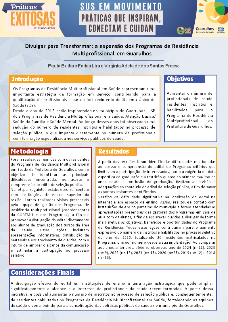 | Divulgar para Transformar: a expansão dos Programas de Residência Multiprofissional em Guarulhos | Paula Buttaro Farias Lira; Virgínia Adelaide dos Santos Frassei | |