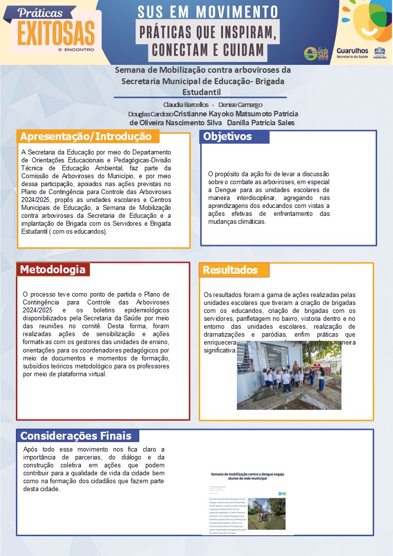 | Semana de Mobilização contra arboviroses da Secretaria de Educação- Brigada Estudantil | Denise de Oliveira Camargo; Claudia Lavínia Barcelos, Douglas Cardoso | |