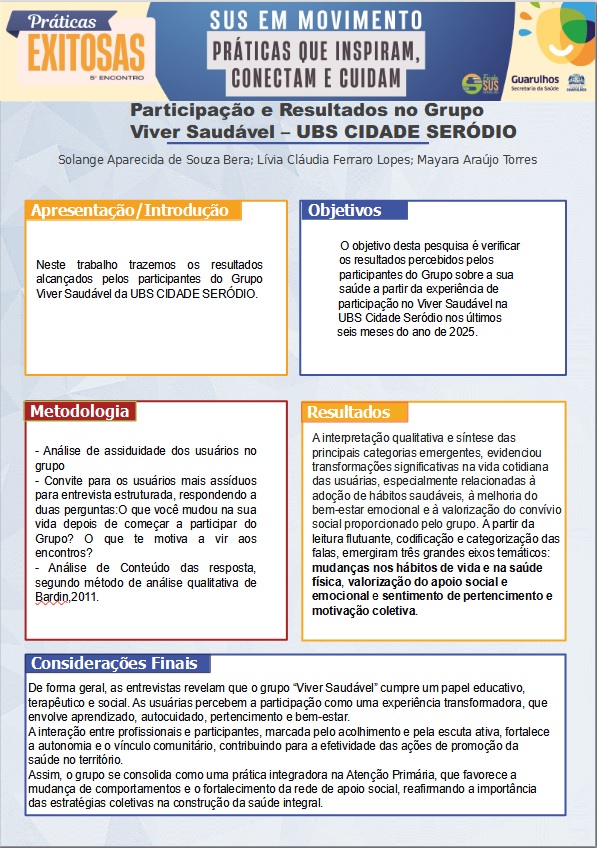 | Participação e Resultados no Grupo Viver Saudável – UBS CIDADE SERÓDIO | SOLANGE APARECIDA DE SOUZA BERA; Mayara Araujo Torres; Lívia Cláudia Ferraro Lopes | |