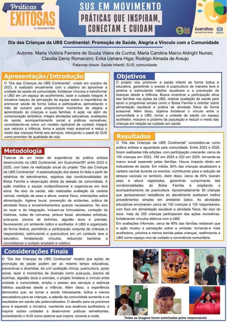 | Dia das Crianças da UBS Continental: Promoção de Saúde, Alegria e Vínculo com a Comunidade | Maria Victória Ferreira de Souza Vieira da Cunha; Maria Carolina Marco Aldrighi Nunes; Claudia Deniz Romanzini; Erika Uehara Higa; Rodrigo Almada de Araujo. | |