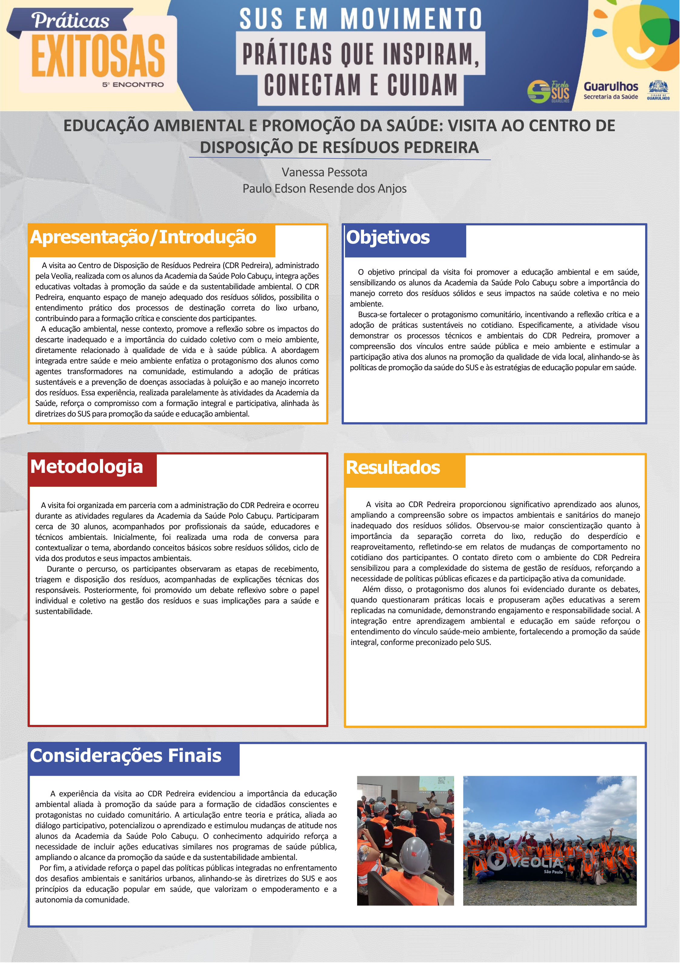 | Educação Ambiental e Promoção da Saúde: Visita ao Centro de Disposição de Resíduos Pedreira | Vanessa Pessota; Paulo Edson Resende dos Anjos. | |