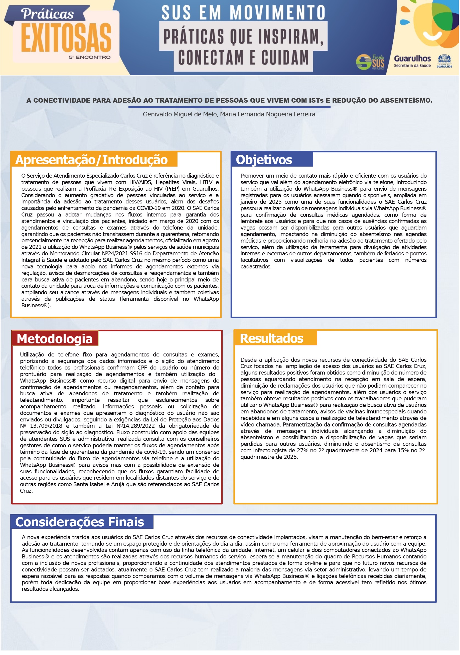 | A CONECTIVIDADE PARA ADESÃO AO TRATAMENTO DE PESSOAS QUE VIVEM COM IST'S E REDUÇÃO DO ABSENTEÍSMO. | GENIVALDO MIGUEL DE MELO; MARIA FERNANDA NOGUEIRA FERREIRA | |