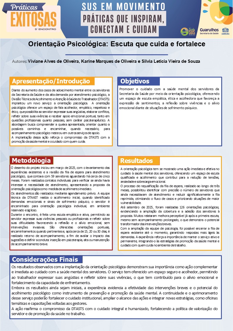 | Orientação Psicológica: Escuta que cuida e fortalece | VIVIANE ALVES DE OLIVEIRA; Karine Marques de Oliveira, Silvia Leticia Vieira de Souza | |