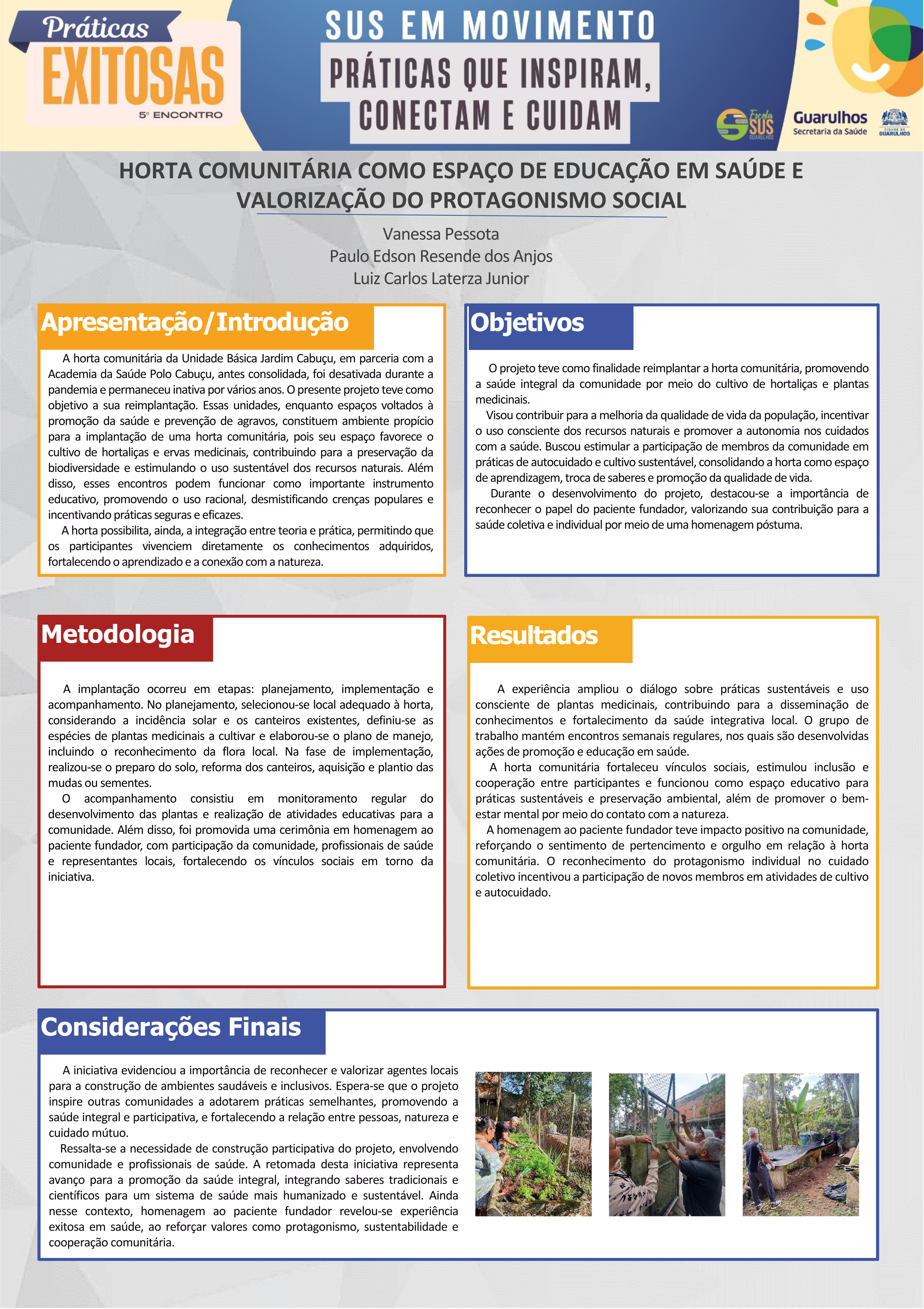 | Horta Comunitária como Espaço de Educação em Saúde e Valorização do Protagonismo Social | Vanessa Pessota; Paulo Edson Resende dos Anjos; Luiz Carlos Laterza Junior. | |