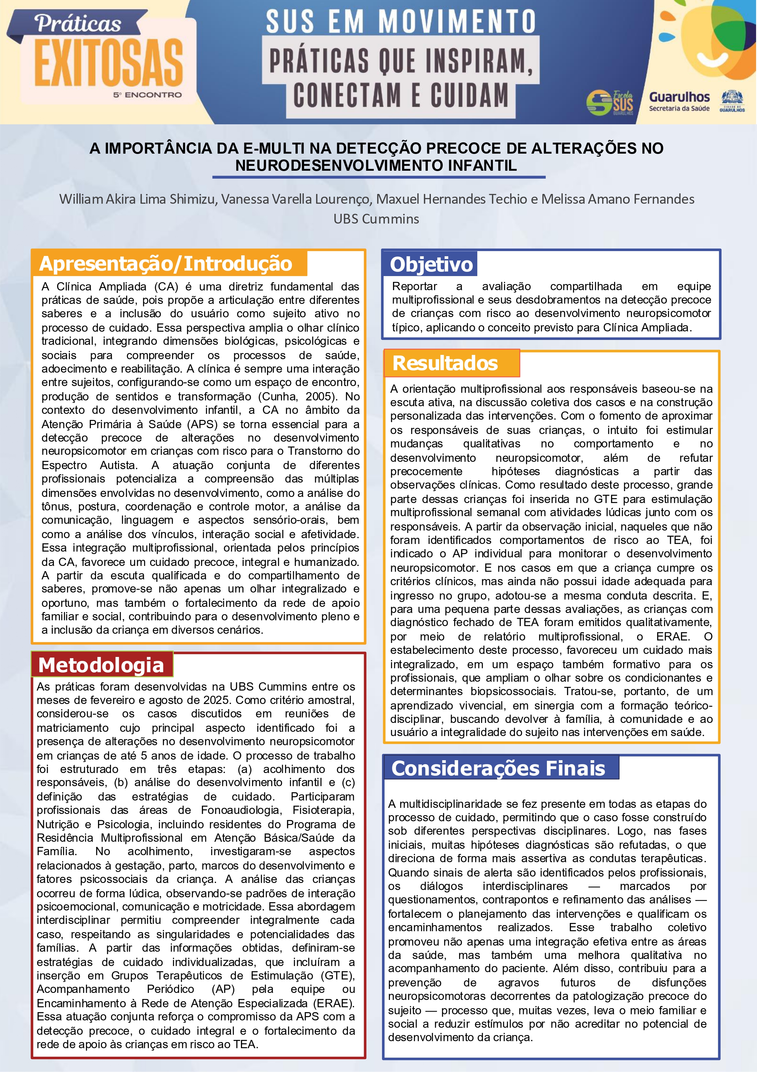 | A IMPORTÂNCIA DA E-MULTI NA DETECÇÃO PRECOCE DE ALTERAÇÕES NO NEURODESENVOLVIMENTO INFANTIL | William Akira Lima Shimizu; Vanessa Varella Lourenço; Maxuel Hernandes Techio, Melissa Amano Fernandes | |
