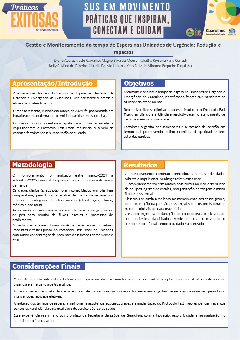 | Gestão e Monitoramento do Tempo de Espera nas Unidades de Urgência: Redução e Impactos | Dione Aparecida de Carvalho; Magno Silva de Moura, Tabatha Krystina Faria Corradi Kelly Cristina de Oliveira, Claudia Batista Urbano, Kelly Feliz de Miranda Baqueiro Faquinha | |
