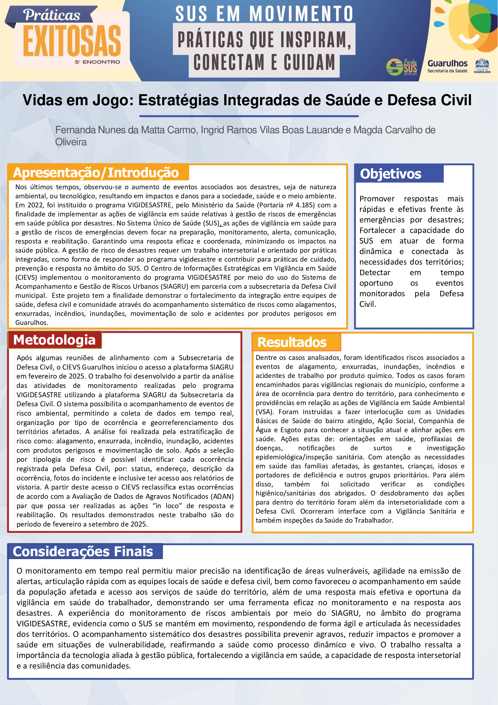 | Vidas em Jogo: Estratégias Integradas de Saúde e Defesa Civil | Fernanda Nunes da Matta Carmo; Ingrid Ramos Vilas Boas Lauande, Magda Carvalho de Oliveira | |