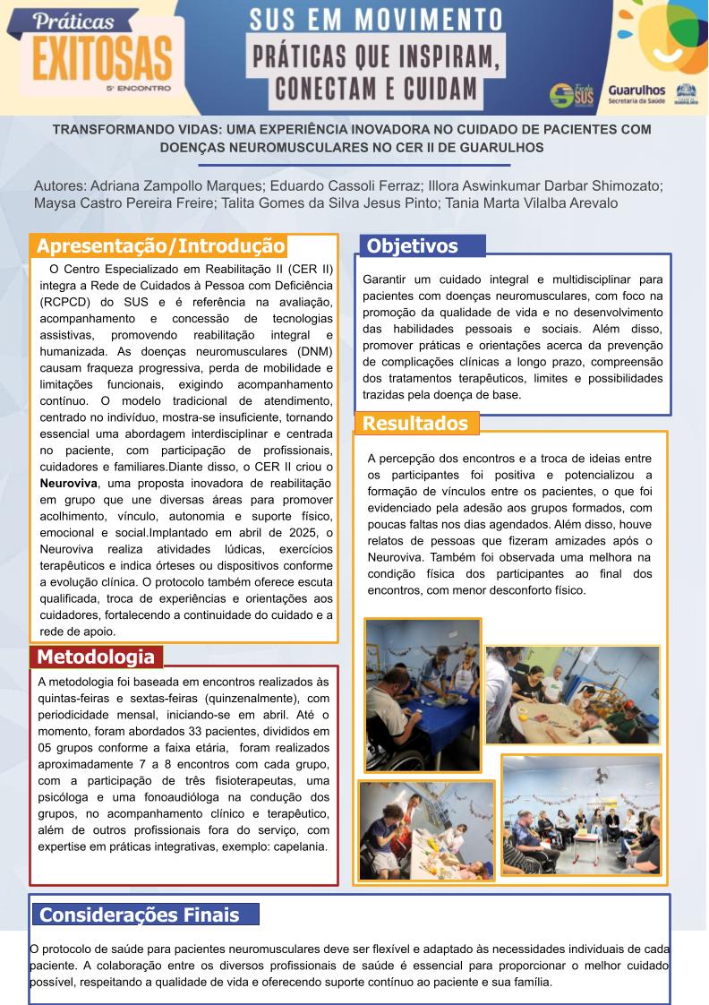 | Transformando Vidas: Uma Experiência Inovadora no Cuidado de Pacientes com Doenças Neuromusculares | MAYSA CASTRO PEREIRA FREIRE; Adriana Zampollo Marques; Eduardo Cassoli Ferraz; Illora Aswinkumar Darbar Shimozato; Talita Gomes da Silva Jesus Pinto; Tania Marta Vilalba Arevalo. | |