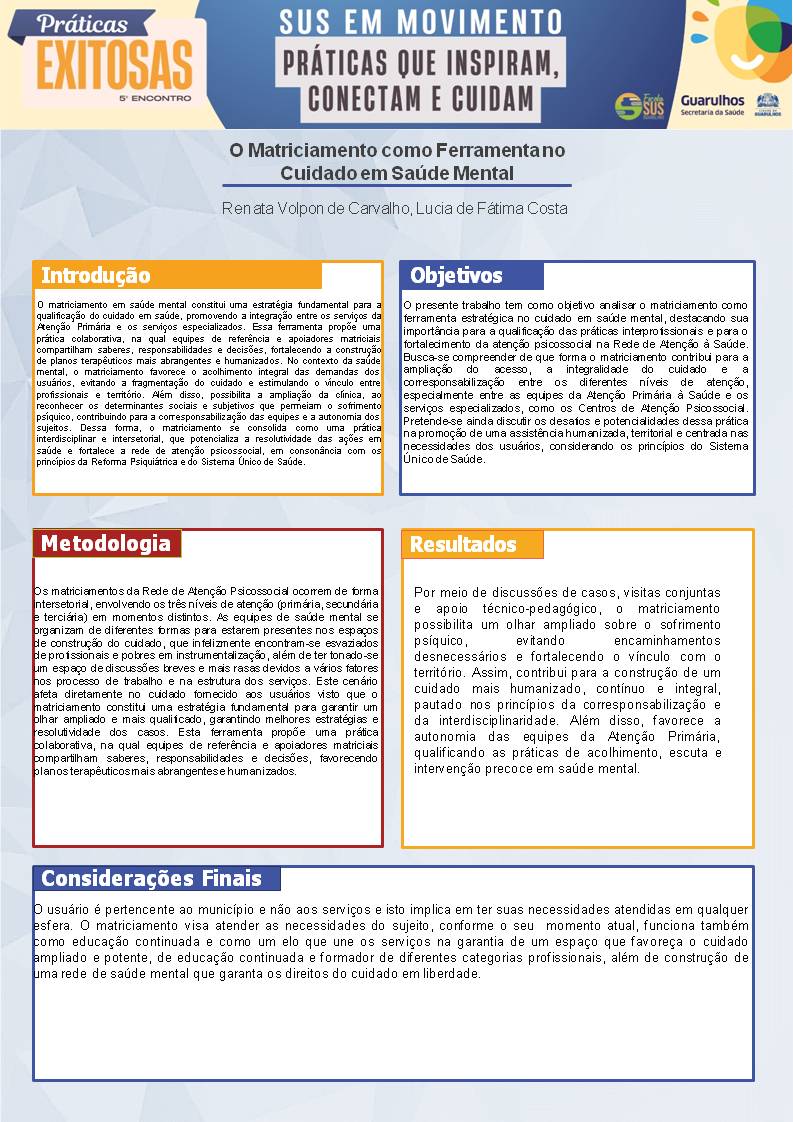 | O Matriciamento como Ferramenta no Cuidado em Saúde Mental | Renata Volpon de Carvalho; Lucia de Fátima Costa. | |