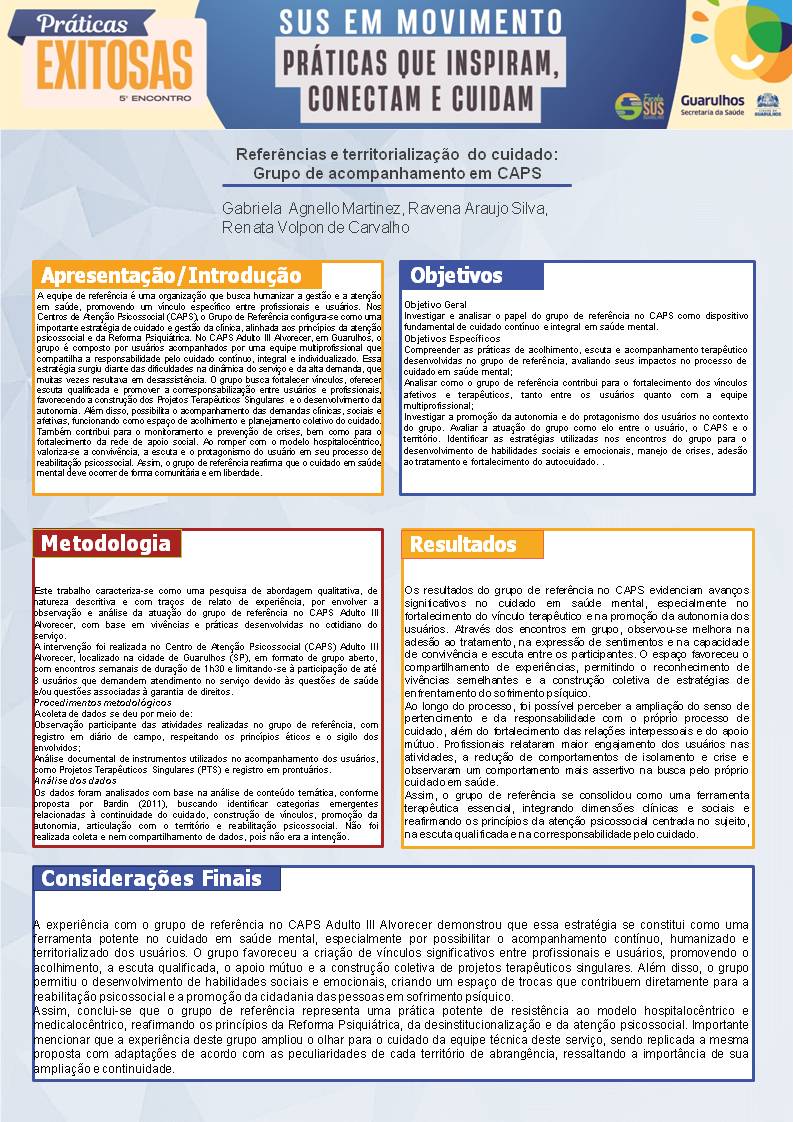 | Referências e territorialização do cuidado: Grupo de acompanhamento em CAPS | Gabriela Agnello Martinez; Ravena Araujo Silva ; Renata Volpon de Carvalho | |