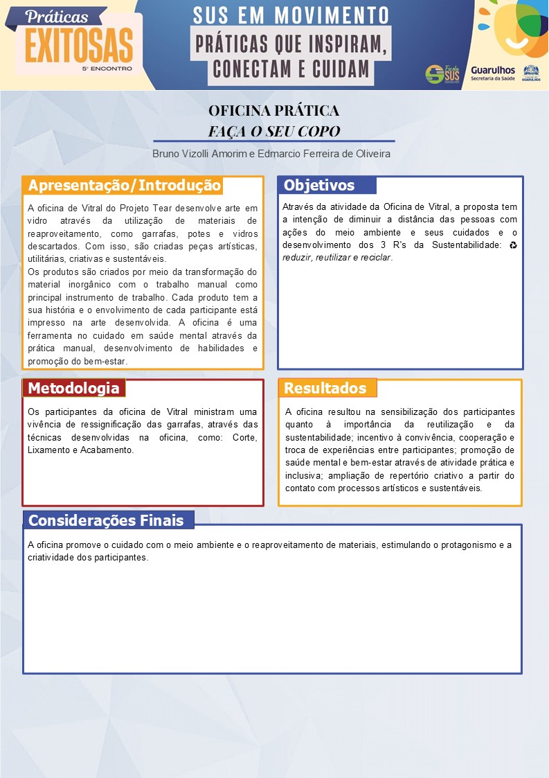 | Oficina Prática Sustentável - Faça o seu copo | Bruno Vizolli Amorim; Edmarcio Oliveira. | |