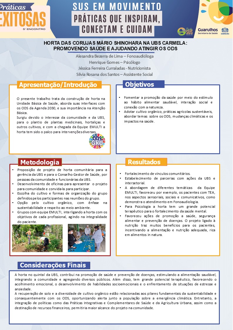 | HORTA DAS CORUJAS MÁRIO SHINOHARA: PROMOVENDO SAÚDE E AJUDANDO ATINGIR OS ODS | Silvia Rosana dos Santos; Alesandra Bezerra de Lima, Henrique Gomes, Jéssica Ferreira Curraladas | |